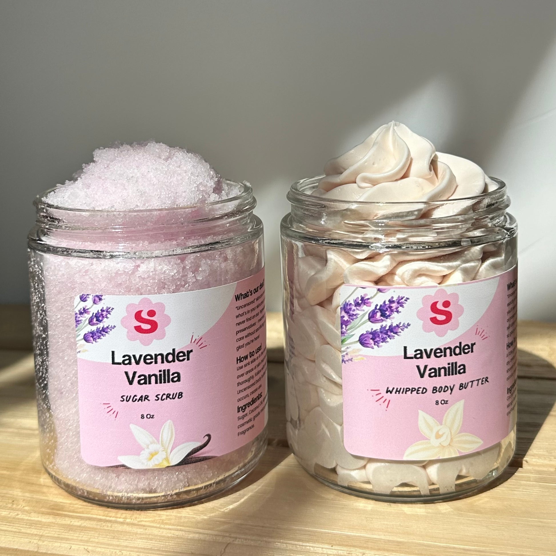 Cozy up with this duo! Comes with a full sized body butter and sugar scrub in the scent lavender vanilla - perfectly sweet and relaxing for your nightly self care needs!